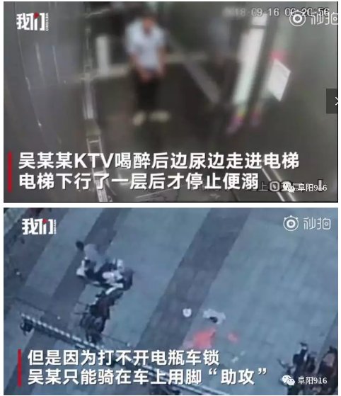 16日凌晨,安徽阜阳,男子吴某某喝醉后在电梯里便溺,将广场围栏扳倒,还盗走一辆电瓶车。